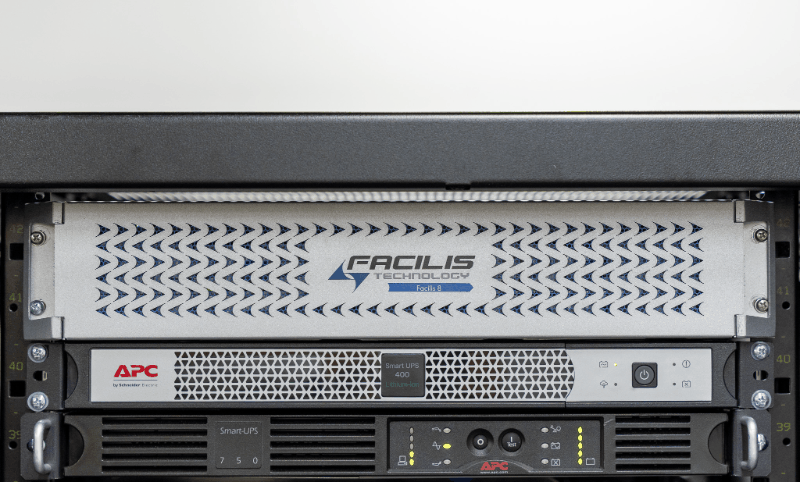 オフライン編集機はAvid Media ComposerでメインPCを2台。それぞれバックアップ用としてサブPCも用意して運用されています。新しい編集室の設立前は同じ部屋で2台体制での運用でしたが、2作品を平行で作業しているときは、それなりにデータの移行や作業進行に問題を抱えていたそうです。いまでは編集室1と2を分けて、フロア中心に位置するマシンルームにFacilisを設置。メインPCはそれぞれイーサネットスイッチを経由せずに10GbEでFacilisに直結しています。このように限られたクライアント台数であれば、スイッチを経由することなくダイレクトにデータへアクセスすることができ、それがコストと故障リスクを減らせるFacilisストレージの特徴の一つになります。